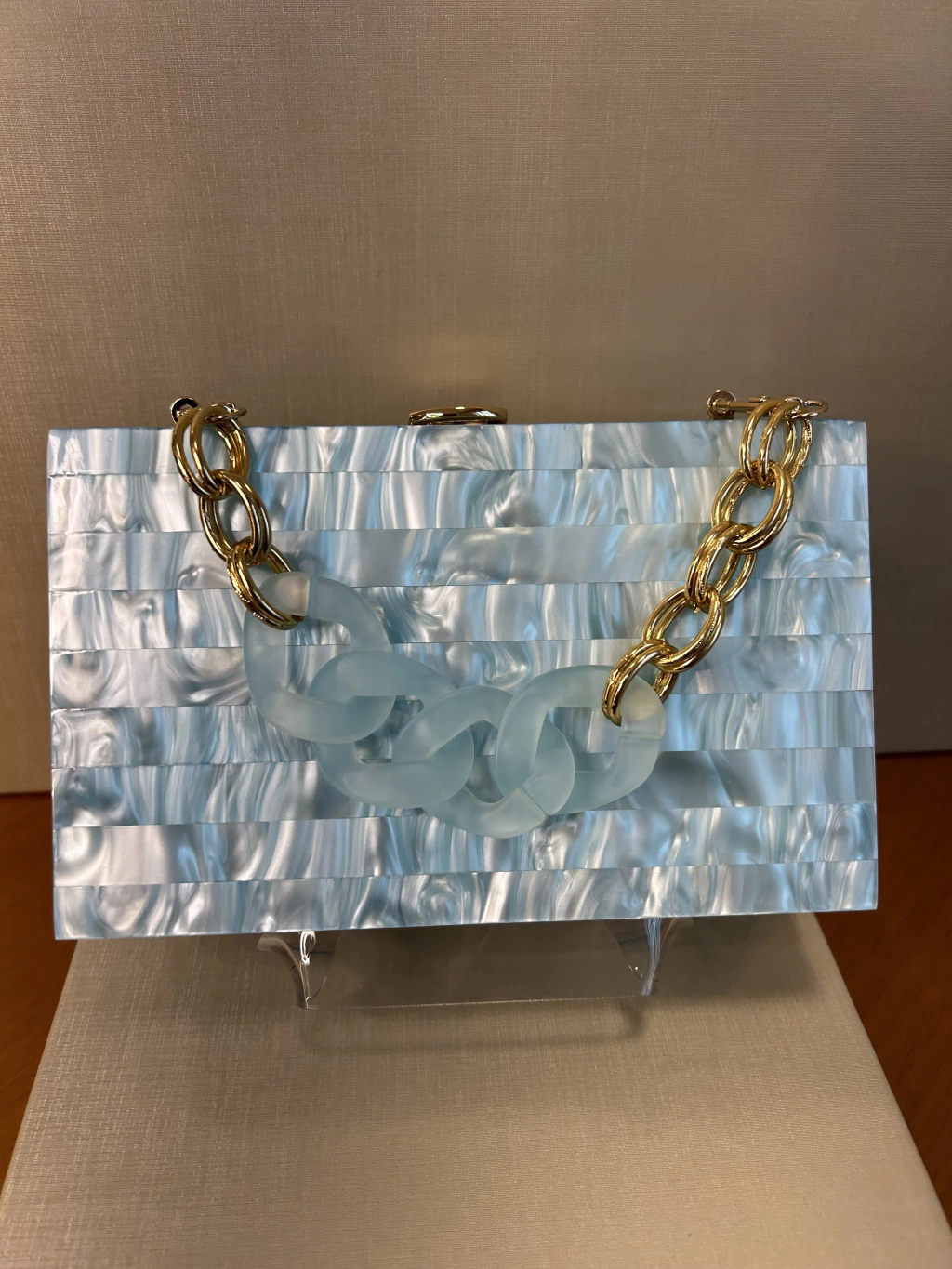 Clutch de festa retangular em acrílico. É forrada internamente em cetim e acompanha 2 alças removíveis na cor dourada. Fecho de encaixe também no dourado. Super espaçosa, cabendo perfeitamente todos os modelos de celulares.